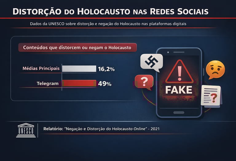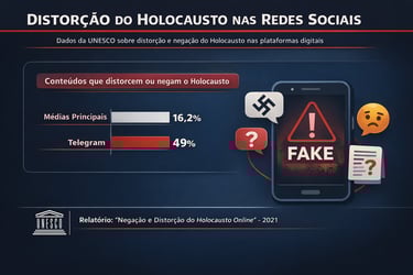 A UNESCO e a ONU analisaram a presença de negação e distorção do Holocausto em Facebook, Instagram, Telegram, TikTok e Twitter/X. O estudo apontou que 16,2% do conteúdo relacionado ao Holocausto nas principais plataformas negava ou distorcia fatos fundamentais; no Telegram, a proporção chegou a 49% do conteúdo público relacionado ao tema. A UNESCO também destacou que, em sua forma mais extrema, a distorção não apenas questiona os fatos, mas glorifica o Holocausto, usa humor e memes codificados para banalizar o sofrimento das vítimas e criar portas de entrada para radicalização.