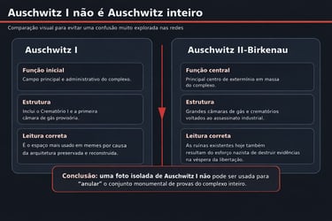 Outro erro recorrente nas redes é tratar Auschwitz como se fosse uma única construção, um único prédio, um único “ponto de prova”. Historicamente, isso é falso. Auschwitz era um complexo com diferentes campos. O USHMM (Museu Memorial do Holocausto dos Estados Unidos) resume de forma clara: Auschwitz consistia em três campos principais, incluindo um centro de extermínio. Mais de 1,1 milhão de pessoas morreram ali, aproximadamente um milhão delas judeus. O complexo teve papel central na chamada “Solução Final”, o plano nazista de exterminar os judeus da Europa.
