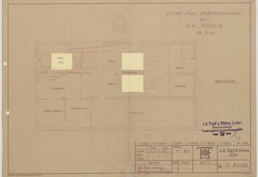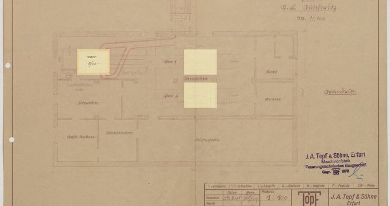 Foi assinalada a planta de 1941 do crematório I com o terceiro forno, então previsto para ser instalado. Adicionalmente, destacam-se os fornos já existentes, bem como o canal de incêndio que corre sob o piso até à chaminé situada junto ao edifício. Fonte: Arquivo do Museu de Auschwitz.