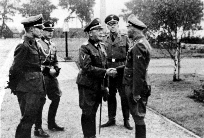 A fotografia mostra o Comandante Rudolf Höss, próximo ao Kommandantur durante visita oficial de dignitários da SS (não identificados). A chaminé do crematório I KL Auschwitz é vista ao fundo. Fonte: Arquivos do Museu de Auschwitz