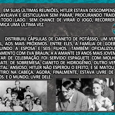 No bunker, distribui cápsulas de cianeto aos mais próximos, oficializa o casamento com Eva Braun e, por fim, tira a própria vida. O mundo se livra de um ditador – e, junto com ele, de um viciado em poder e em substâncias químicas.
